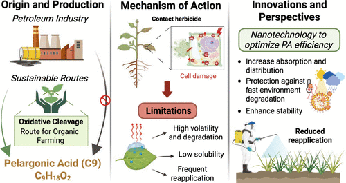 Pelargonic acid (PA), or nonanoic acid, is a saturated fatty acid with a nine-carbon chain and low toxicity. Although initially applied in processes, PA has gained relevance in agriculture as a bioherbicide, driven by demand for sustainable alternatives to synthetic herbicides. Recently approved for agricultural use in several countries, PA has demonstrated effective control of a range of weed species; however, its agricultural use faces limitations, such as complexity of synthesis, high volatility, degradation in field, and need for frequent applications. As a contact herbicide, PA acts through rapid membrane disruption that underlies its burndown effect but requires high application rates and repeated treatments in systems. This review provides an analysis of PA, addressing its relevance and consolidation as a bioherbicide with sustainability goals, discussing transition from conventional herbicides to molecules. It highlights that nanotechnology-based approaches can address limitations, improving efficacy and persistence, supporting integration into management.