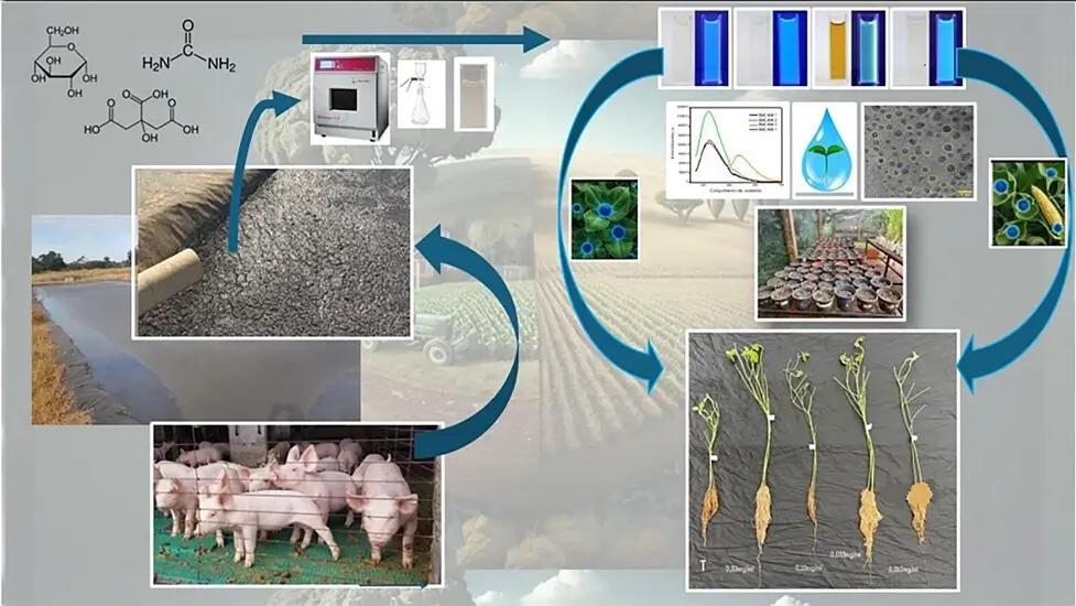 Um uso valioso de resíduos biológicos sólidos e líquidos envolve sua transformação em nanomateriais funcionais. Este estudo apresenta a síntese verde de nanocarbonos luminescentes, denominados BioC-dots, derivados de efluente de granja suína, com potencial promissor para aplicações agrícolas. O BioC-dot1 foi desenvolvido utilizando apenas o efluente, juntamente com diversas variantes funcionalizadas (BioC-dot2, BioC-dot3 e BioC-dot4).