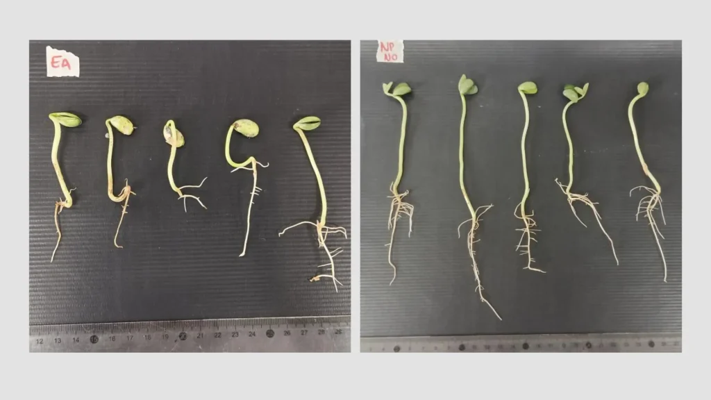 As sementes tratadas com NO nas melhores dosagens apresentaram emergência mais rápida, plantas mais altas, maior vigor e massa, além de raízes e parte aérea mais desenvolvidas — sinais claros de um início de ciclo mais saudável.